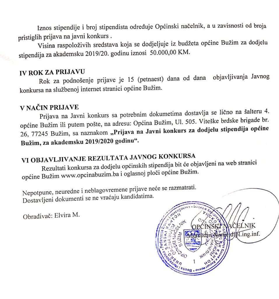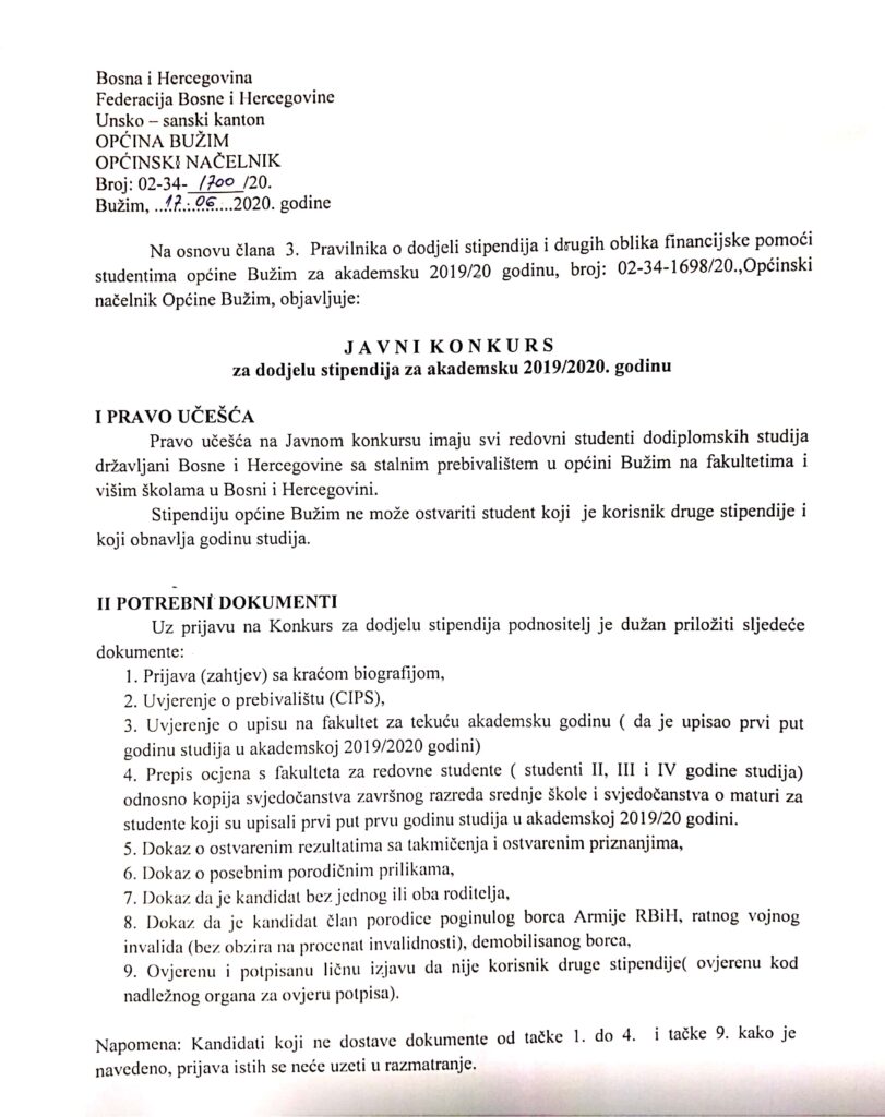 Vijesti Bužim JAVNI KONKURS ZA DODJELU STIPENDIJA OPĆINE BUŽIM ZA AKADEMSKU 2019/20 GODINU Agan Skenderović, 6 godina ago 1 min read 3152 Pravilnik-o-dodjeli-stipendijaDownload Vijesti Bužim MUFTIJA KUDIĆ POSJETIO OPĆINU BUŽIM I NAČELNIKA MERSUDINA NANIĆA Vijesti Bužim U BUŽIMU OBILJEŽEN DAN POLICIJE USK Related posts Vijesti Bužim ASFALTIRAN NEKATEGORISANI PUT KONJODOR-LJUBIJANKIĆI Agan Skenderović, 12 mjeseci ago 1 min read Ostalo, Vijesti Bužim HALIDA EMRIĆ S POSTAVKOM JAPODES OSVOJILA NAGRADU “COLLEGIUM ARTISTICUM 2015“(VIDEO) Agan Skenderović, 11 godina ago 1 min read Ostalo, Vijesti Bužim PRIKUPLJENO 3.000 KNJIGA ZA BIBLIOTEKU U BUŽIMU Agan Skenderović, 11 godina ago 1 min read Ostalo, Vijesti Bužim SVEČANO POTPISAN UGOVOR ZA IZGRADNJU MUZEJA GRADA BUŽIMA SA ZAVIČAJNOM ZBIRKOM I MUZEJ SOBOM 505.VITEŠKE BRIGADE Agan Skenderović, 6 godina ago 2 min read Vijesti Bužim POLOŽEN KAMEN TEMELJAC ZA IZGRADNJU DJEČIJEG VRTIĆA BUŽIM Agan Skenderović, 7 mjeseci ago 1 min read Ostalo, Vijesti Bužim ČETVRTI BUŽIMSKI LIKOVNI SALON I ČETVRTI BUŽIMSKI INSTRUMENTALNI KONCERT Agan Skenderović, 10 godina ago 1 min read