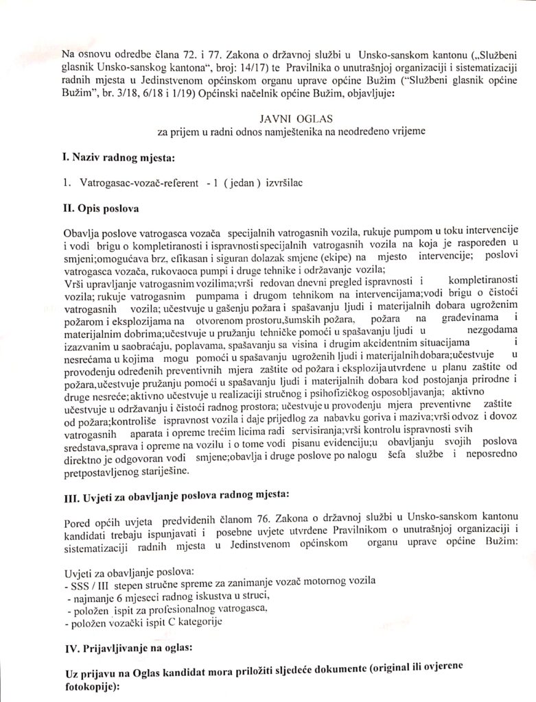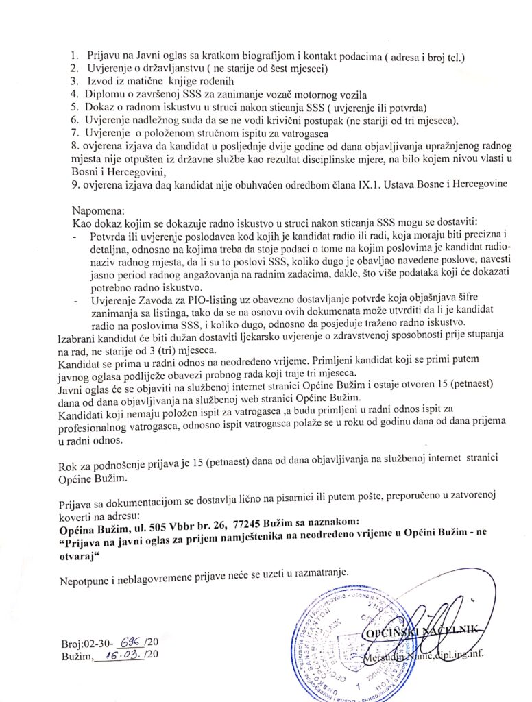 Vijesti Bužim JAVNI OGLAS ZA PRIJEM U RADNI ODNOS NAMJEŠTENIKA-VATROGASCA/VOZAČA Agan Skenderović, 6 godina ago 1 min read 1394 Vijesti USK ODLUKA O POSEBNOM REŽIMU RADA OPĆINSKOG ORGANA UPRAVE Vijesti Bužim Preporuka Štaba Civilne zaštite Općine Bužim Related posts Ostalo, Vijesti Bužim POZIV NA DRUŽENJE PRIPADNIKA 105./505. VITEŠKE BRIGADE Agan Skenderović, 9 godina ago 1 min read Vijesti Bužim ZAVRŠENO ASLATIRANJE LOKALNOG PUTA DO IZLETIŠTA SVETINJA Agan Skenderović, 3 godine ago 1 min read Vijesti Bužim ČESTITKA POVODOM TRIDESETOG ROĐENDANA OPĆINE BUŽIM Agan Skenderović, 1 godina ago 2 min read Ostalo, Vijesti Bužim Svečano otvoreno “Spomen obilježje ponosa i pobjeda Armije RBiH” Agan Skenderović, 8 godina ago 3 min read Vijesti Bužim OPĆINSKI NAČELNIK I OPĆINSKO VIJEĆE PODRŽALI IZRADU MONOGRAFIJE OSNOVNE ŠKOLE BUŽIM Agan Skenderović, 6 godina ago 1 min read Ostalo, Vijesti Bužim U BUŽIMU ODRŽAN PRVI 24 SATNI MIL-SIM AIRSOFT SUSRET U BIH (VIDEO) Agan Skenderović, 10 godina ago 3 min read