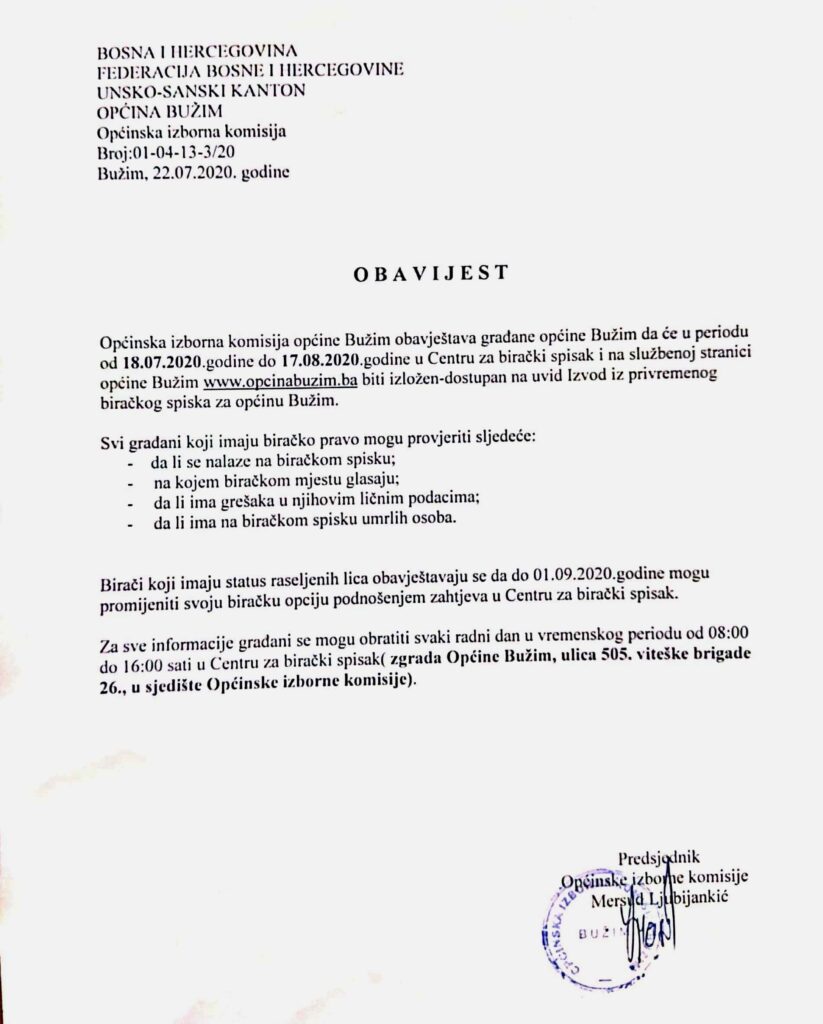Općinska izborna komisija obavještava građane općine Bužim, a u povodu Lokalnih izbora koji će se održati 15. novembra ove godine, da je do 17.08.2020.godine dostupan PRIVREMENI BIRAČKI SPISAK OPĆINE BUŽIM na službenoj web stranici općine u kategoriji IZBORI: