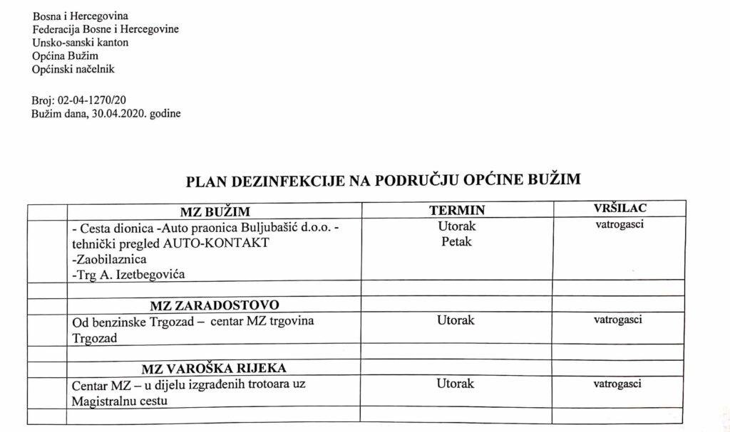 Vijesti Bužim PLAN DEZINFEKCIJE NA PODRUČJU OPĆINE BUŽIM Agan Skenderović, 6 godina ago 1 min read 1368 Vijesti Bužim ČESTITKA NAČELNIKA OPĆINE POVODOM DANA ZLATNIH LJILJANA, DANA LOGORAŠA I DANA POBJEDE NAD FAŠIZMOM Vijesti Bužim ZAKLJUČAK ŠTABA CZ BUŽIM ZA PRAVNA I FIZIČKA LICA KOJIMA NIJE ZABRANJEN RAD Related posts Vijesti Bužim OBAVIJEST ORGANIZACIONOG ODBORA ZA OBILJEŽAVANJE ZNAČAJNIH DATUMA Agan Skenderović, 3 godine ago 1 min read Ostalo, Vijesti Bužim NASTAVLJAJU SE RADOVI NA “PIVNICAMA” Agan Skenderović, 10 godina ago 1 min read Vijesti Bužim NAČELNIK NANIĆ POTPISAO MEMORANDUM SA KATARSKIM FONDOM ZA RAZVOJ Agan Skenderović, 9 mjeseci ago 2 min read Ostalo, Vijesti Bužim MINISTRI U VLADI USK-A U SLUŽBENOJ POSJETI OPĆINI BUŽIM Agan Skenderović, 11 godina ago 1 min read Vijesti Bužim POTPISAN UGOVOR O ODRŽAVANJU JAVNE RASVJETE U BUŽIMU Agan Skenderović, 4 godine ago 1 min read Vijesti Bužim JAVNI KONKURS ZA DODJELU STIPENDIJA ZA AKADEMSKU 2022/23 Agan Skenderović, 3 godine ago 1 min read