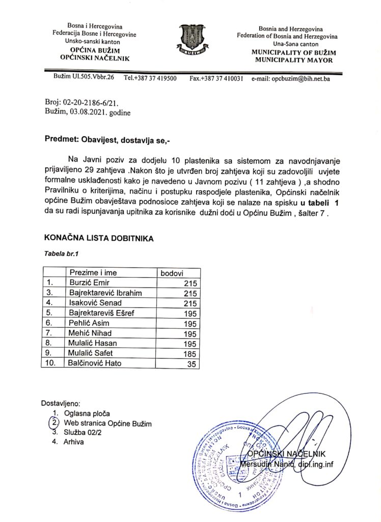 Vijesti Bužim OBAVIJEST – PLASTENICI Agan Skenderović, 5 godina ago 1 min read 2729 Vijesti Bužim OTVORENA DVADESET I ŠESTA MANIFESTACIJA SLOBODARSKI DANI VITEŠKOG GRADA BUŽIMA 2021. Vijesti Bužim PLAKAT I PROGRAM MANIFESTACIJE “SLOBODARSKI DANI VITEŠKOG GRADA BUŽIMA 2021” Related posts Ostalo, Vijesti Bužim VEČERAS SVEČANOST IZBORA SPORTISTE OPĆINE BUŽIM ZA 2013. GODINU Agan Skenderović, 12 godina ago 1 min read Vijesti Bužim Obilježavanje 100 godina savremenog obrazovanja u Bužimu Agan Skenderović, 12 godina ago 1 min read Vijesti Bužim NAČELNIK NANIĆ IZDAO GRAĐEVINSKU DOZVOLU ZA OBJEKAT POLICIJSKE STANICE BUŽIM Agan Skenderović, 5 godina ago 1 min read Vijesti Bužim NAČELNIK POSJETIO STARE I IZNEMOGLE Agan Skenderović, 11 godina ago 1 min read Vijesti Bužim OBAVIJEST ZA POLJOPRIVREDNE PROIZVOĐAČE Agan Skenderović, 4 godine ago 2 min read Vijesti Bužim SERVISNE INFORMACIJE ZA PERIOD OD 04.05.2015. DO 11.05.2015. Agan Skenderović, 11 godina ago 3 min read