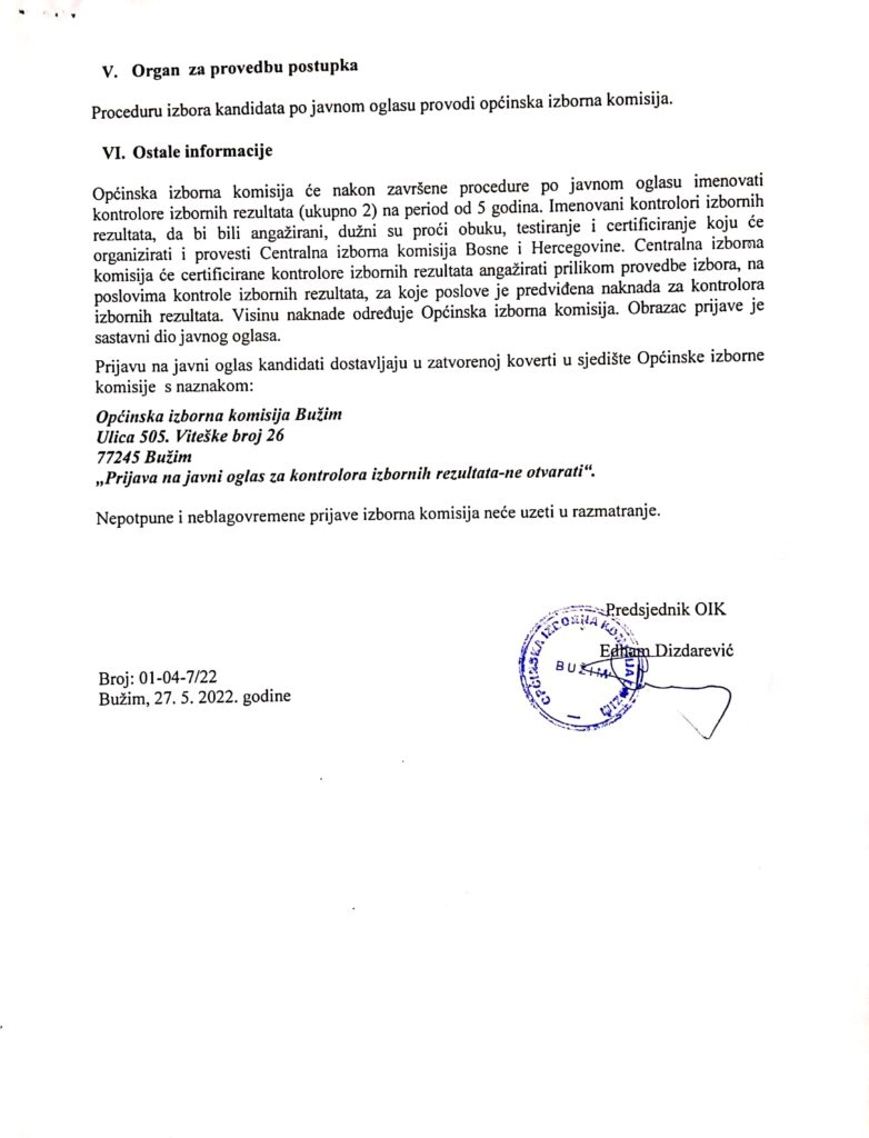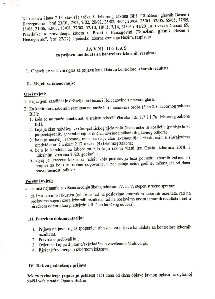 Vijesti Bužim JAVNI OGLAS ZA PRIJAVU KANDIDATA ZA KONTROLORE IZBORNIH REZULTATA Agan Skenderović, 4 godine ago 1 min read 663 UPITNIK MOŽETE PREUZETI OVDJE ILI U CENTRU ZA PRUŽANJE USLUGA GRAĐANIMA: Upitnik-kontrolori-obrazac Vijesti Bužim POZITIVNE PRIČE IZ BUŽIMA DONOSI O KANAL Vijesti Bužim OIK BUŽIM:JAVNI OGLAS ZA IZBOR KANDIDATA ZA POPUNU REZERVNOG SPISKA KVALIFIKOVANIH OSOBA ZA IMENOVANJE ČLANOVA BIRAČKIH ODBORA ZA OTVARANJE VREĆA I BROJANJE GLASAČKIH LISTIĆA U CILJU PRAVILNOG OBJEDINJAVANJA IZBORNIH REZULTATA Related posts Ostalo, Vijesti Bužim SERVISNE INFORMACIJE U PERIODU OD 12.01.2015. DO 19.01.2015. Agan Skenderović, 11 godina ago 2 min read Vijesti Bužim NAČELNIK OPĆINE BUŽIM U PRVOJ RADNOJ POSJETI OPĆINI VELIKA KLADUŠA Agan Skenderović, 1 godina ago 2 min read Vijesti Bužim JAVNI OGLAS Agan Skenderović, 2 godine ago 1 min read Ostalo, Vijesti Bužim MINISTAR RAMIĆ DAO PUNU PODRŠKU OSNIVANJU MUZEJA OPĆINE BUŽIM Agan Skenderović, 9 godina ago 3 min read Vijesti Bužim OBAVIJEST ZA GRAĐANE OPĆINE BUŽIM Agan Skenderović, 12 godina ago 1 min read Vijesti Bužim SERVISNE INFORMACIJE ZA PERIOD 12.10. 2015. – 19.10.2015. Agan Skenderović, 11 godina ago 2 min read