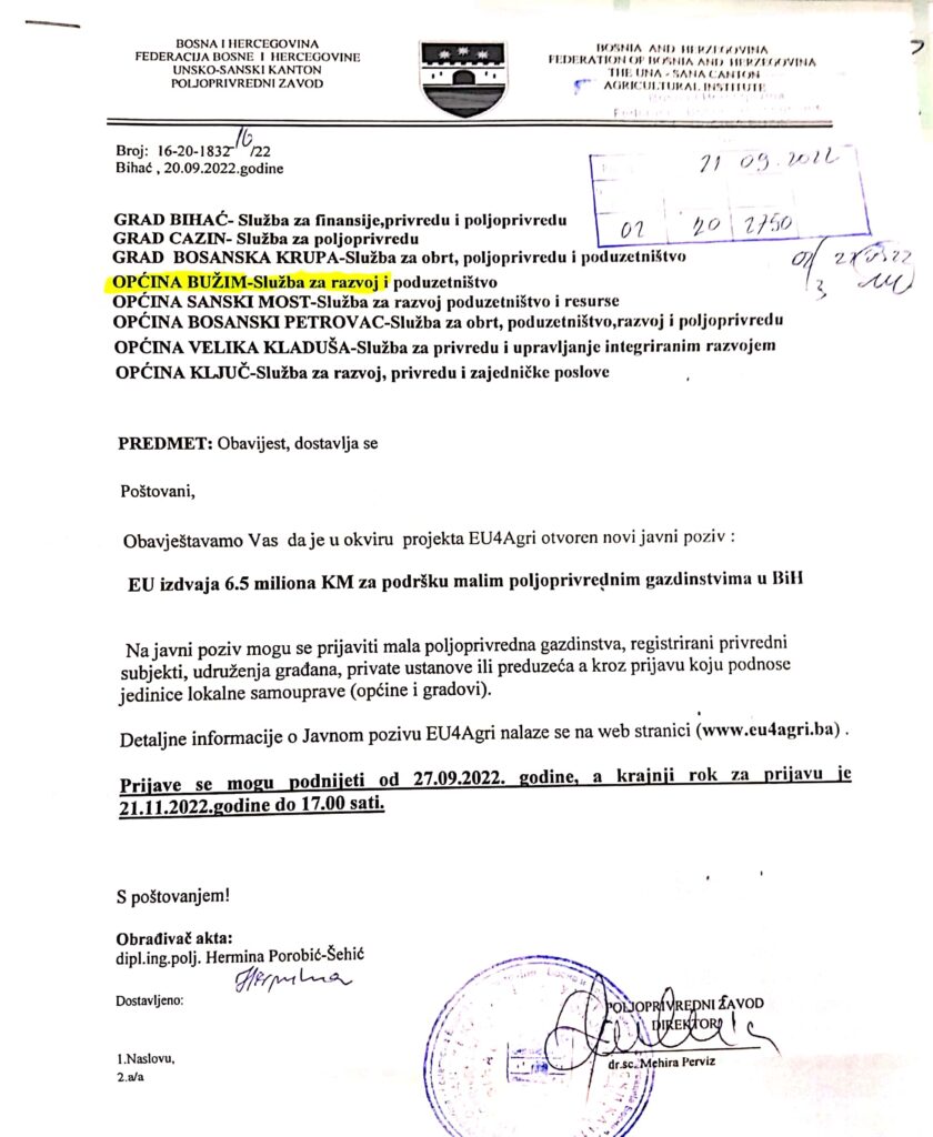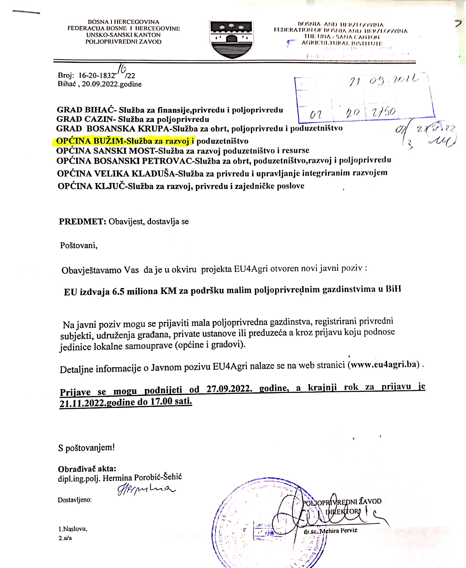 Vijesti Bužim OBAVIJEST O OTVORENOM JAVNOM POZIVU Agan Skenderović, 4 godine ago 1 min read 1944 Obavještavamo vas da je otvoren novi JAVNI POZIV u okviru projekta EU4Agri za poljoprivredna gazdinstva, registrirane privrednesubjekte, udruženja građana, privatne ustanove i poduzeća. Vijesti Bužim POTPISAN UGOVOR O IZGRADNJI FISKULTURNE SALE U ČAVI Vijesti Bužim USKORO REALIZACIJA PROJEKATA PUTEM IFAD-a Related posts Vijesti Bužim MUFTIJA KUDIĆ POSJETIO OPĆINU BUŽIM I NAČELNIKA MERSUDINA NANIĆA Agan Skenderović, 6 godina ago 2 min read Ostalo, Vijesti Bužim PREZENTACIJA PROJEKTA RAZVOJA RURALNOG POSLOVANJA Agan Skenderović, 10 godina ago 1 min read Vijesti Bužim POTPISANI UGOVORI ZA IZGRADNJU I REKONSTRUKCIJU JAVNIH RASVJETA Agan Skenderović, 3 godine ago 1 min read Ostalo, Vijesti Bužim SAZIV ZA XXI REDOVNU SJEDNICU OPĆINSKOG VIJEĆA Agan Skenderović, 11 godina ago 1 min read Ostalo, Vijesti Bužim ČESTITKA U POVODU 5. OKTOBRA-SVJETSKOG DANA UČITELJA Agan Skenderović, 9 godina ago 1 min read Vijesti Bužim ODRŽANA PRESS KONFERENCIJA ORGANIZACIONOG ODBORA SLOBODARSKIH DANA Agan Skenderović, 4 godine ago 2 min read