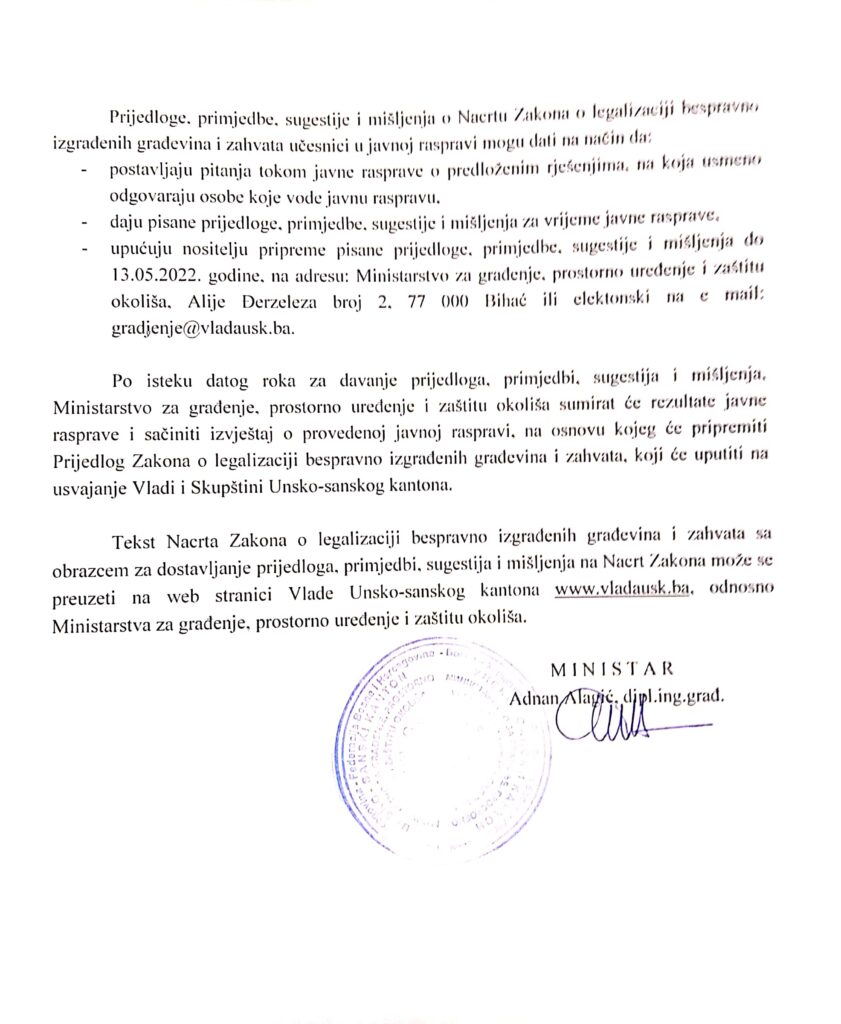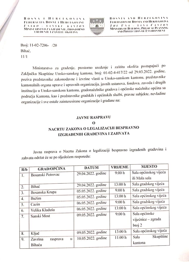 Ministarstvo za građenje, prostorno uređenje i zaštitu okoliša poziva predstavnike zakonodavne i izvršne vlasti u Unsko sanskom kantonu, predstavnike javnih ustanova, fondova, zavoda i drugih institucija u Unsko sanskom kantonu, gradonačelnike gradova i načelnike općina, kao i predstavnike gradskih i općinskih službi, pravne subjekte, nevladine organizacije i sve ostale organizacije i građane na JAVNU RASPRAVU O NACRTU ZAKONA O LEGALIZACIJI BESPRAVNO IZGRAĐENIH GRAĐEVINA I ZAHVATA  koja će održati u Bužimu, Mala sala Općinskog vijeća 05.05.2022.godine sa početkom u 13,00 sati.