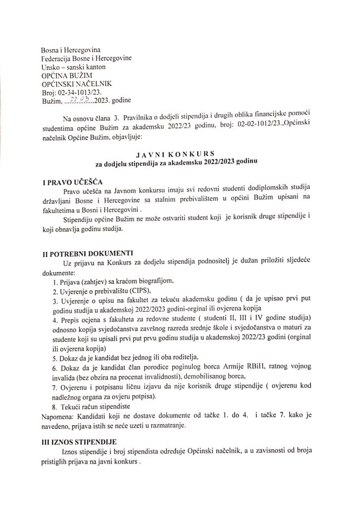 Vijesti Bužim JAVNI KONKURS ZA DODJELU STIPENDIJA ZA AKADEMSKU 2022/23 Agan Skenderović, 3 godine ago 1 min read 2693 Vijesti Bužim JAVNI POZIV ZA POLJOPRIVREDNIKE Vijesti Bužim PUŠTENA U FUNKCIJU JAVNA RASVJETA SPAHIĆA BRDO U MZ LUBARDA Related posts Ostalo, Vijesti Bužim PRIJEM UNIVERZITETSKIH RADNIKA Agan Skenderović, 11 godina ago 1 min read Vijesti Bužim DANČILOVAC DOBIO JAVNU RASVJETU Agan Skenderović, 12 godina ago 1 min read Vijesti Bužim ODRŽANA PRESS KONFERENCIJA ORGANIZACIONOG ODBORA SLOBODARSKIH DANA Agan Skenderović, 3 godine ago 3 min read Vijesti Bužim ODRŽANA XVIII SJEDNICA OPĆINSKOG VIJEĆA BUŽIM Agan Skenderović, 12 godina ago 2 min read Vijesti Bužim DONATORI IZ KRALJEVINE NORVEŠKE DONIRALI VATROGASNO VOZILO Agan Skenderović, 3 godine ago 1 min read Vijesti Bužim JAVNI KONKURS ZA PREDSJEDNIKE/ZAMJENIKE BIRAČKIH ODBORA Agan Skenderović, 2 godine ago 1 min read