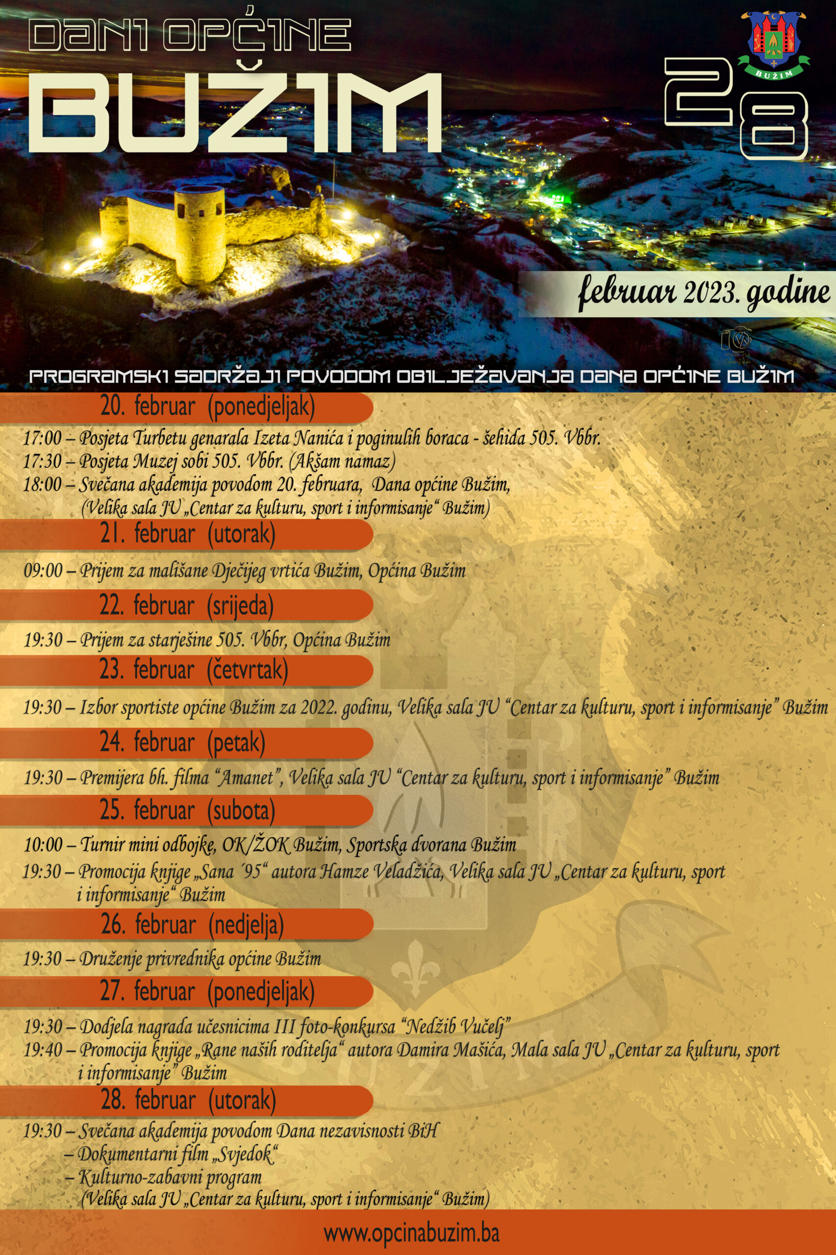 20. Februara 2023. godine navršava se 28 godina od ponovnog dobivanja statusa Općine Bužim. Kao i ranijih godina manifestacija će sadržavati kulturne, sportske, vjerske i edukativne sadržaje.
