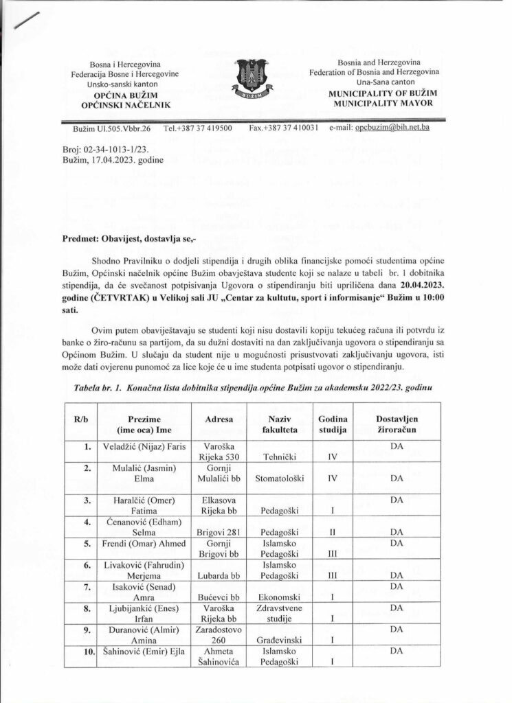 Shodno Pravilniku o dodjeli stipendija i drugih oblika financijske pomoći studentima općine Bužim, Općinski načelnik općine Bužim obavještava studente koji se nalaze na spisku dobitnika stipendija, da će potpisivanje Ugovora o stipendiranju biti upriličeno dana 20.04.2023. godine (ČETVRTAK) u Velikoj sali JU „Centar za kultutu, sport i informisanje“ Bužim u 10:00 sati.