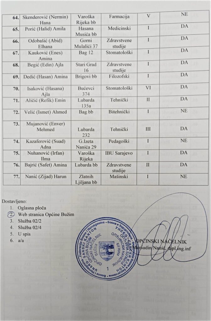 Za akademsku 2022/2023. godinu svi studenti koji su ispunili formalno-pravne uvjete dobili su stipendiju. Na zadovoljstvo svih nas i ove godine nastavljamo s dobrom praksom i podržavamo naše studente, a tako je ove akademske godine pravo na stipendiju općine Bužim ostvarilo 77 studenta.