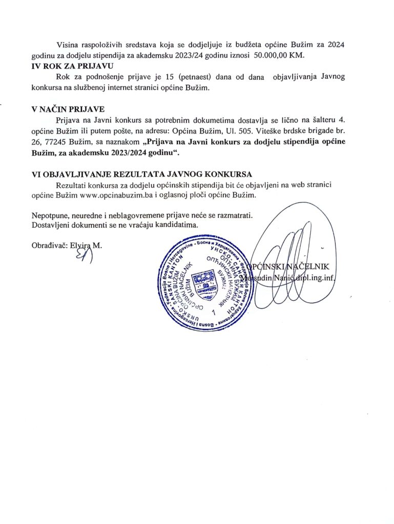 Vijesti Bužim JAVNI KONKURS ZA DODJELU STIPENDIJA ZA AKADEMSKU 2023/2024 Agan Skenderović, 2 godine ago 1 min read 2393 Vijesti Bužim JAVNI POZIV -JAVNA RASPRAVA ZA ODREĐIVANJE LOKACIJE ZA IZGRADNJU DOMA ZDRAVLJA Vijesti Bužim DELEGACIJA VLADE I SKUPŠTINE USK-a U POSJETI OPĆINI BUŽIM Related posts Vijesti Bužim ČESTITKA NAČELNIKA OPĆINE POVODOM DANA DRŽAVNOSTI Agan Skenderović, 5 godina ago 1 min read Vijesti Bužim PODRŠKA RADU UDRUŽENJA ILMIJA USK-a Agan Skenderović, 8 godina ago 1 min read Ostalo, Vijesti Bužim NOVA DIONICA ASFALTA NA PUTU EMINIĆI-ABDIĆI Agan Skenderović, 11 godina ago 1 min read Vijesti Bužim NAČELNIK NANIĆ PRIMIO NOGOMETNOG REPREZENTATIVCA BiH ENEDINA MULALIĆA Agan Skenderović, 5 godina ago 1 min read Vijesti Bužim OBILJEŽENA DVADESET I ŠESTA GODIŠNJICA OD POGIBIJE GENERALA IZETA NANIĆA Agan Skenderović, 5 godina ago 1 min read Vijesti Bužim U ZNAK SJEĆANJA NA BUŽIMSKE VITEZOVE MJESNE ZAJEDNICE BUŽIM Agan Skenderović, 6 godina ago 1 min read
