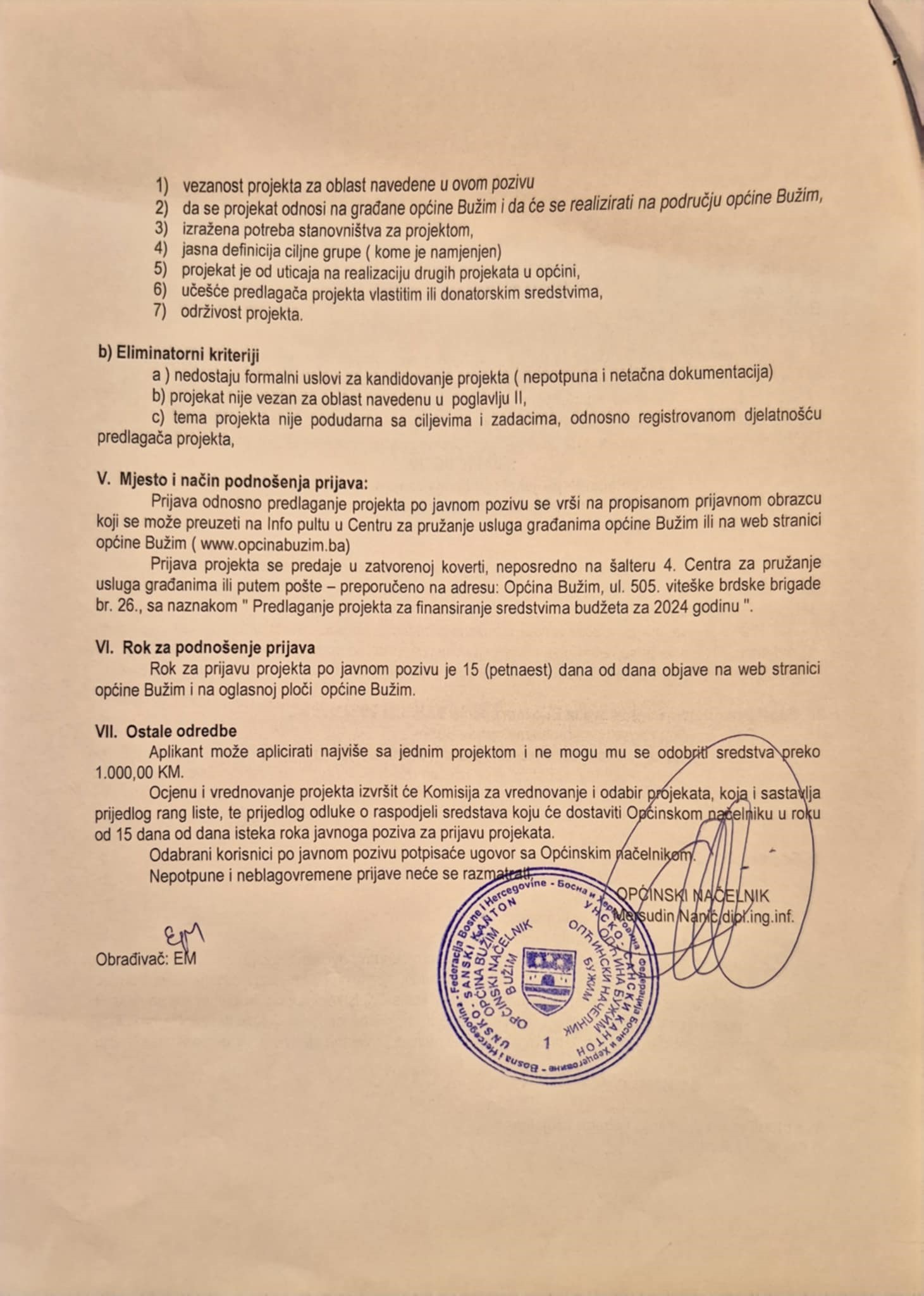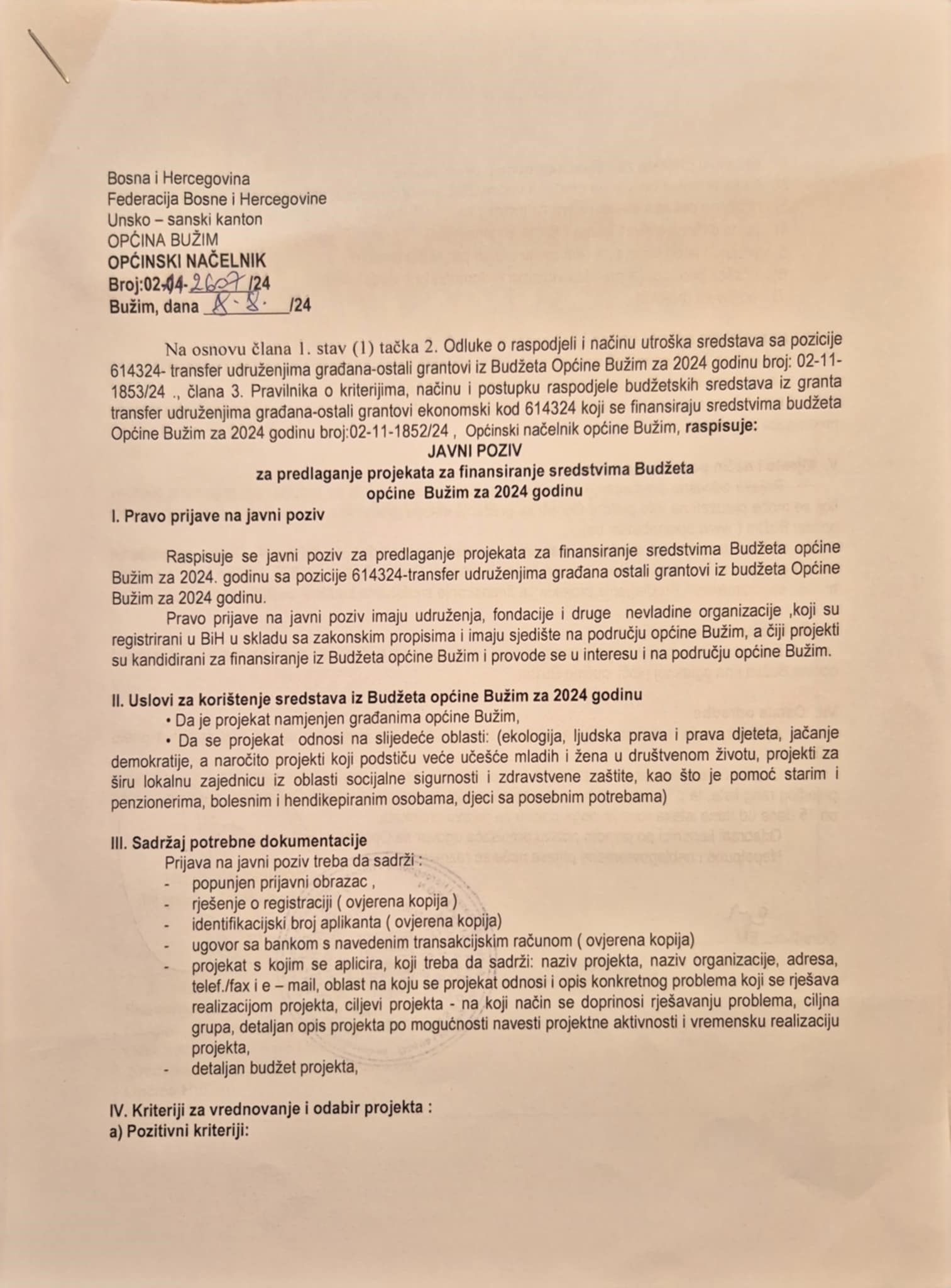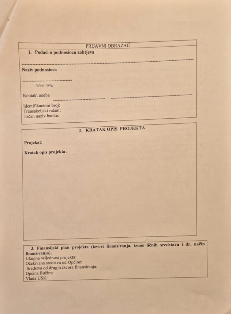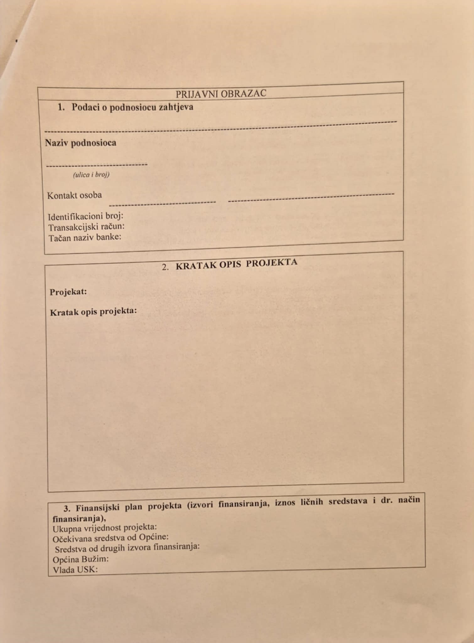 Vijesti Bužim JAVNI POZIV ZA PREDLAGANJE PROJEKATA ZA FINASIRANJE IZ BUDŽETA OPĆINE BUŽIM ZA 2024. GODINU Agan Skenderović, 2 godine ago 1 min read 1362 Vijesti Bužim OBAVIJEST O JAVNOJ LICITACIJI ZA PRODAJU PUTNIČKOG VOZILA Vijesti Bužim JAVNI KONKURS ZA PREDSJEDNIKE/ZAMJENIKE BIRAČKIH ODBORA Related posts Vijesti Bužim IZVRŠENA DEZINFEKCIJA ZGRADE OPĆINE BUŽIM I JAVNIH USTANOVA Agan Skenderović, 6 godina ago 1 min read Vijesti Bužim SERVISNE INFORMACIJE U PERIODU OD 02.02.2015. DO 09.02.2015. Agan Skenderović, 11 godina ago 2 min read Ostalo, Vijesti Bužim NAKON DESET GODINA, SVEČANO U RAD PUŠTEN VODOVOD “PIVNICE“ Agan Skenderović, 10 godina ago 2 min read Vijesti Bužim POTPISANI UGOVORI ZA IZGRADNJU DVIJE JAVNE RASVJETE Agan Skenderović, 4 godine ago 1 min read Vijesti Bužim OBAVIJEST: VRŠI SE DEMINIRANJE NA PODRUČJU OPĆINE BUŽIM Agan Skenderović, 4 godine ago 1 min read Ostalo, Vijesti Bužim ŽENAMA BUŽIMA POSEBAN DAN Agan Skenderović, 10 godina ago 1 min read