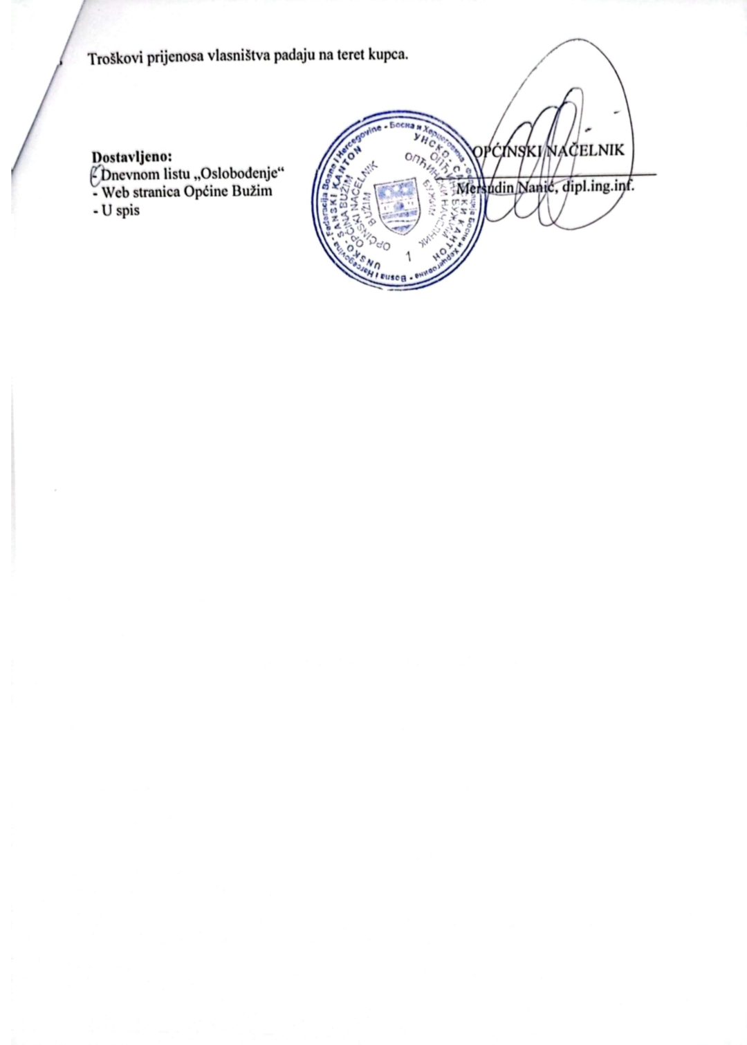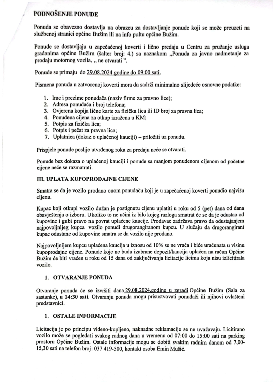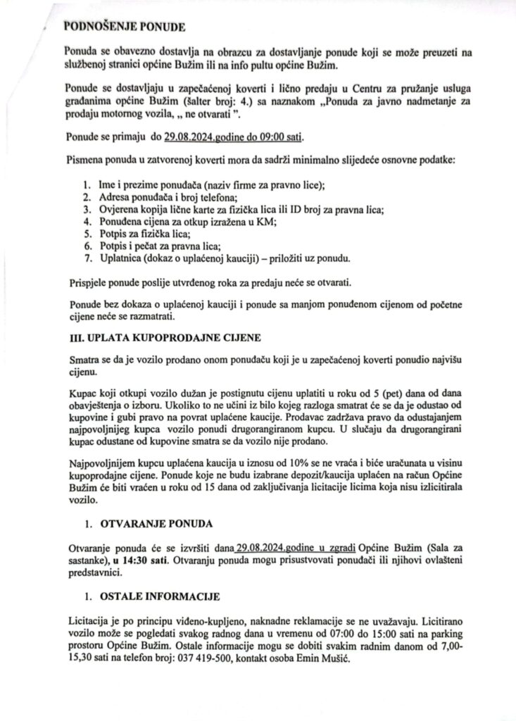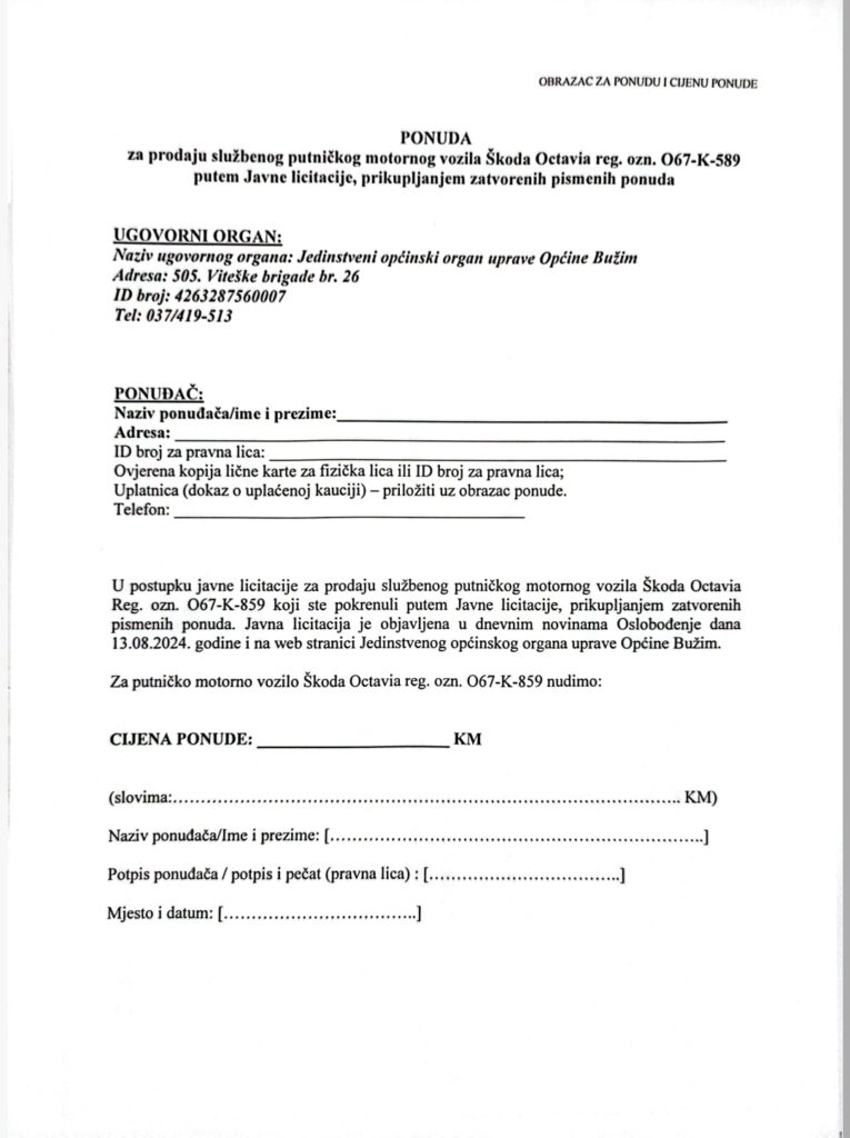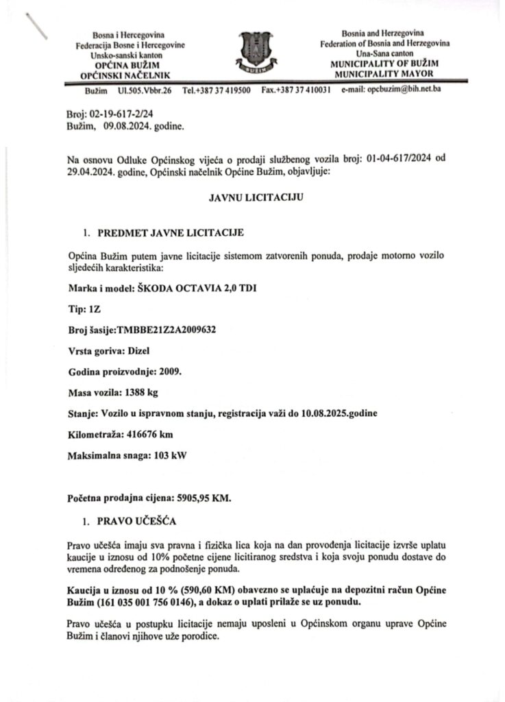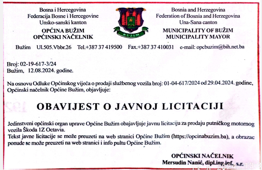 Vijesti Bužim OBAVIJEST O JAVNOJ LICITACIJI ZA PRODAJU PUTNIČKOG VOZILA Agan Skenderović, 2 godine ago 1 min read 2361 Vijesti Bužim FEDERALNI MINISTAR POLJOPRIVREDE KEMAL HRNJIĆ U POSJETI BUŽIMU Vijesti Bužim JAVNI POZIV ZA PREDLAGANJE PROJEKATA ZA FINASIRANJE IZ BUDŽETA OPĆINE BUŽIM ZA 2024. GODINU Related posts Ostalo, Vijesti Bužim USKORO PRVI RADOVI NA IZGRADNJI SPORTSKE DVORANE Agan Skenderović, 12 godina ago 2 min read Ostalo, Vijesti Bužim U BUŽIMU ODRŽAN FESTIVAL RADA TEHNIČKIH I STRUČNIH ŠKOLA BiH Agan Skenderović, 7 godina ago 1 min read Ostalo, Vijesti Bužim OPĆINSKO VIJEĆE USVOJILO NACRT BUDŽETA ZA 2017. I ZAKLJUČAK O POKRETANJU REVIZIJE BUDŽETA ZA 2015./2016. Agan Skenderović, 9 godina ago 2 min read Ostalo, Vijesti Bužim NASTAVLJA SE IZGRADNJA LOKALNE PUTNE MREŽE U OPĆINI BUŽIM Agan Skenderović, 9 godina ago 1 min read Ostalo, Vijesti Bužim NASTAVAK IZGRADNJE PUTA U MURATOVIĆIMA Agan Skenderović, 11 godina ago 1 min read Ostalo, Vijesti Bužim JAVNI POZIV ZA PREDLAGANJE KANDIDATA ZA DODJELU JAVNIH PRIZNANJA OPĆINE BUŽIM ZA 2017. GODINU Agan Skenderović, 8 godina ago 5 min read