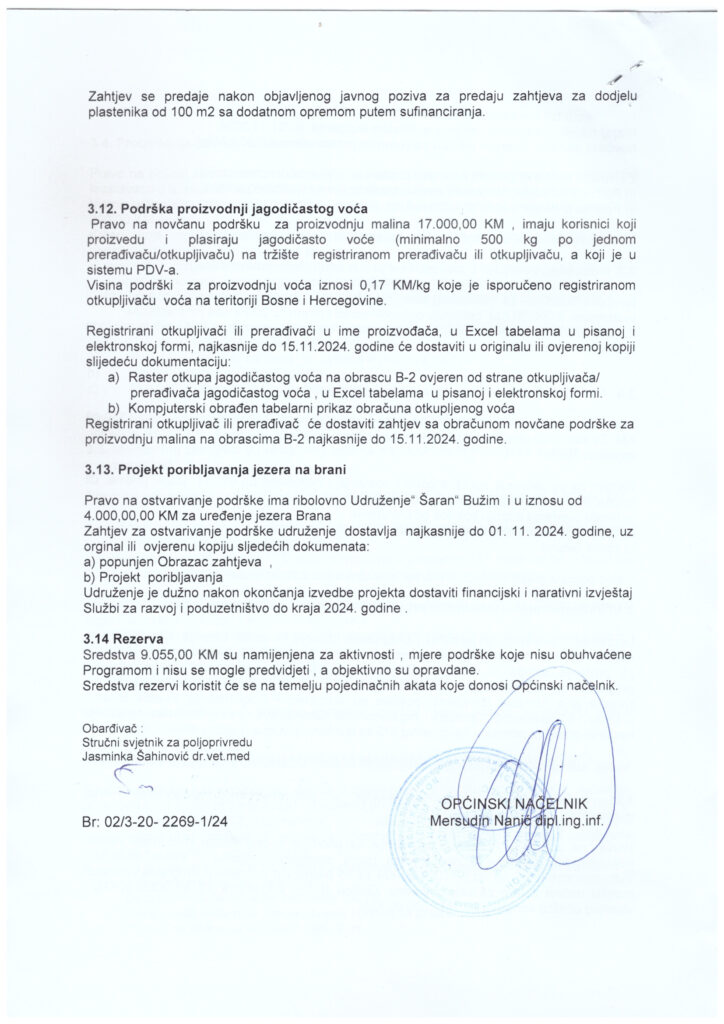 PROGRAM NOVČANIH PODRŠKI OPĆINE BUŽIM ZA POLJOPRIVREDNU PROIZVODNJU U 2024.g.