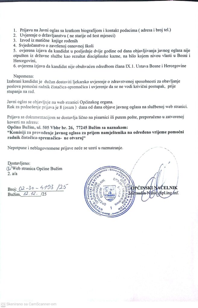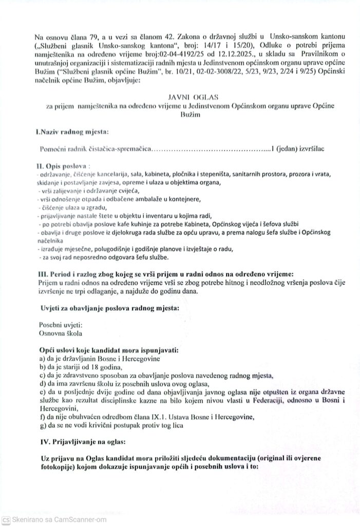 Uncategorized JAVNI KONKURS za popunu radnog mjesta državnog službenika u Općini Bužim Agan Skenderović, 7 mjeseci ago 1 min read