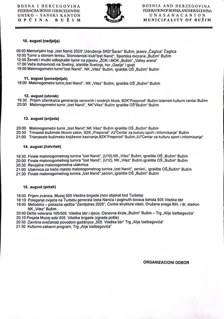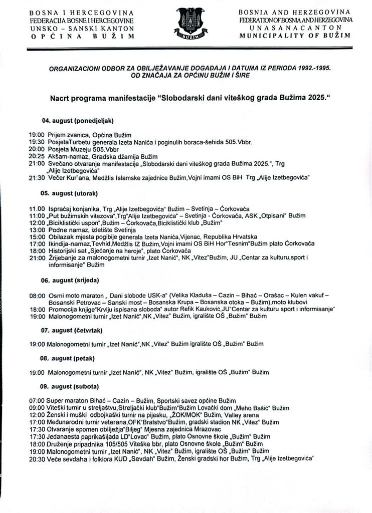 Organizacioni odbor za obilježavanje značajnih datuma iz perioda 1992-1995. obajavljuje Nacrt programa manifestacije „Slobodarski dani viteškog grada Bužima 2025”.