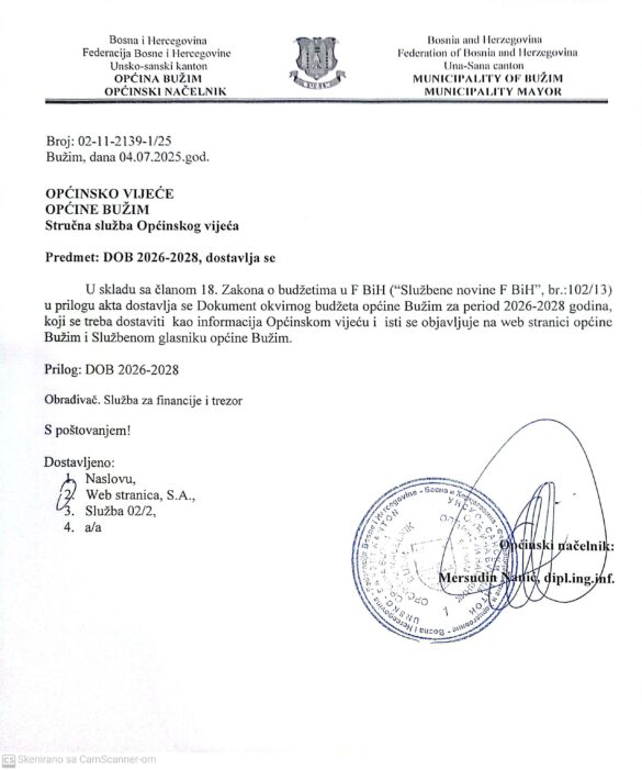 Usvojen Budžet Općine Bužim za 2026. godinu u iznosu od 15.739.527,00 KM Općinsko vijeće Bužim na danas održanoj sjednici Općinskog vijeća usvojilo je Budžet Općine Bužim za 2026. godinu u iznosu od 15.739.527,00 KM, zajedno sa Odlukom o njegovom izvršavanju, čime je osiguran kontinuitet planskog...
