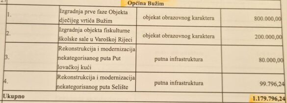 Danas je Federalno ministarstvo finansija općini Bužim uplatilo iznos od 1.179.796,24 KM za kapitalne projekte koji će se sigurno raditi u narednom periodu a to su: izgradnja Dječijig vrtića Bužim u iznosu od 800.000,00 KM, izgradnja fiskulturne sale Varoška Rijeka 200.000,00 KM, izgradnja nekategorisanog puta...