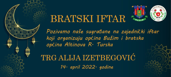 Poštovani sugrađani, pozivamo vas na “Bratski iftar” koji će biti upriličen na Trgu “Alija Izetbegović”, dana 14. aprila (četvrtak) u organizaciji Općine Bužim i bratske Općine Altinova iz R.Turske. Obezbijeđeno je 700 iftara, koje posebno za ovu priliku pripremaju kuhari iz Turske.